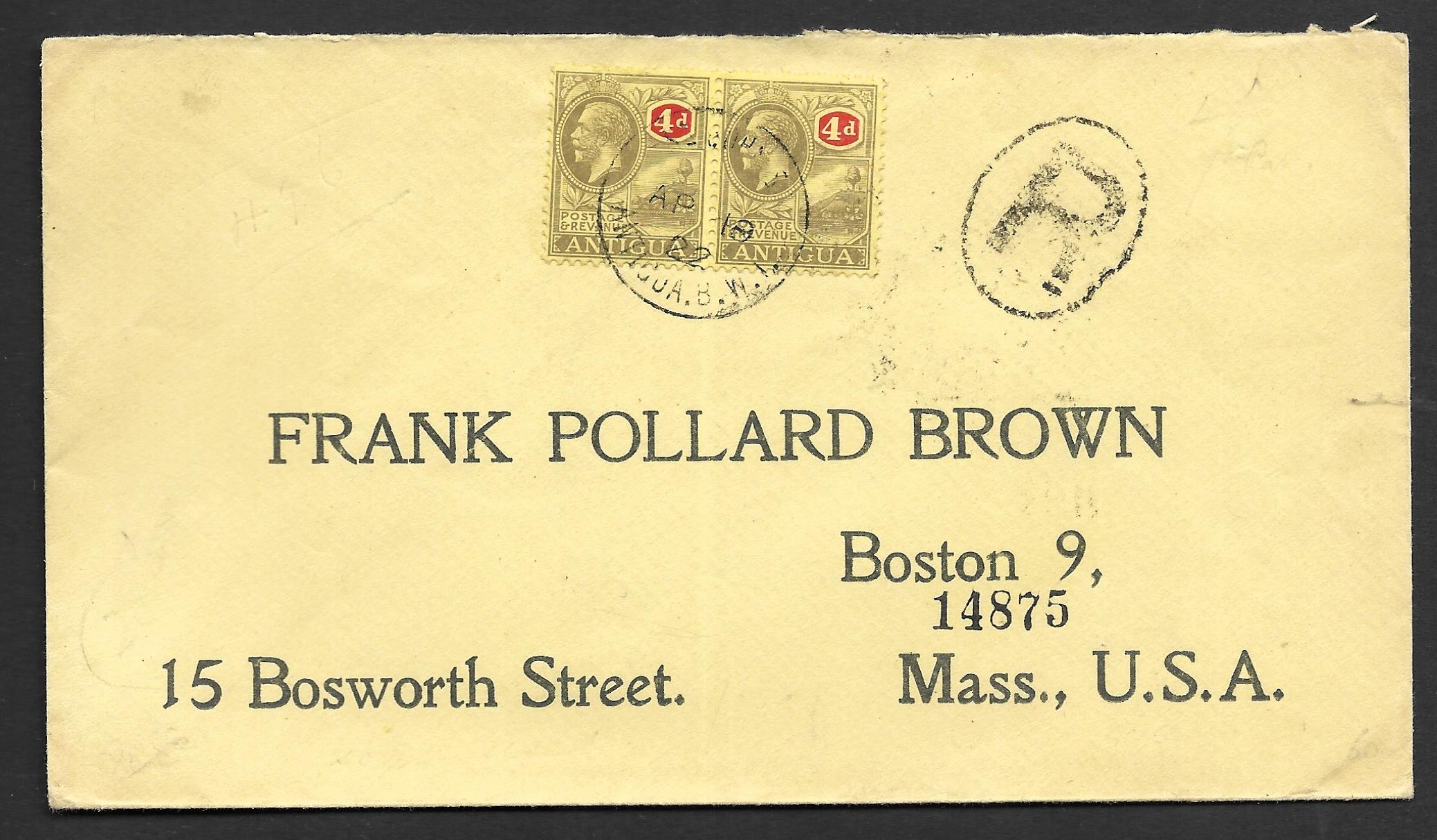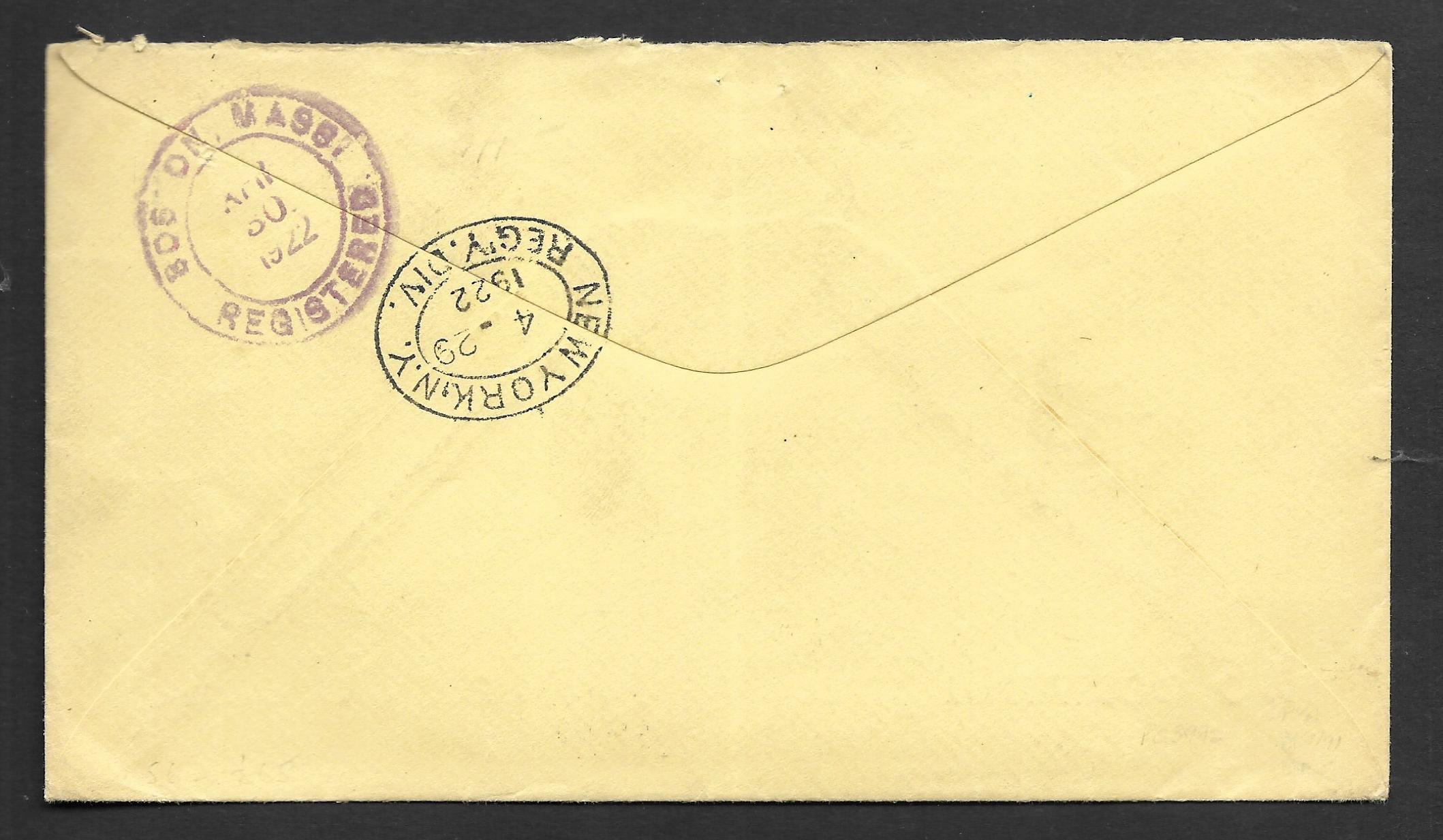 Antigua 1922 George V Registered cover to Boston USA at Eight Pence rate. Has backstamps on rear.