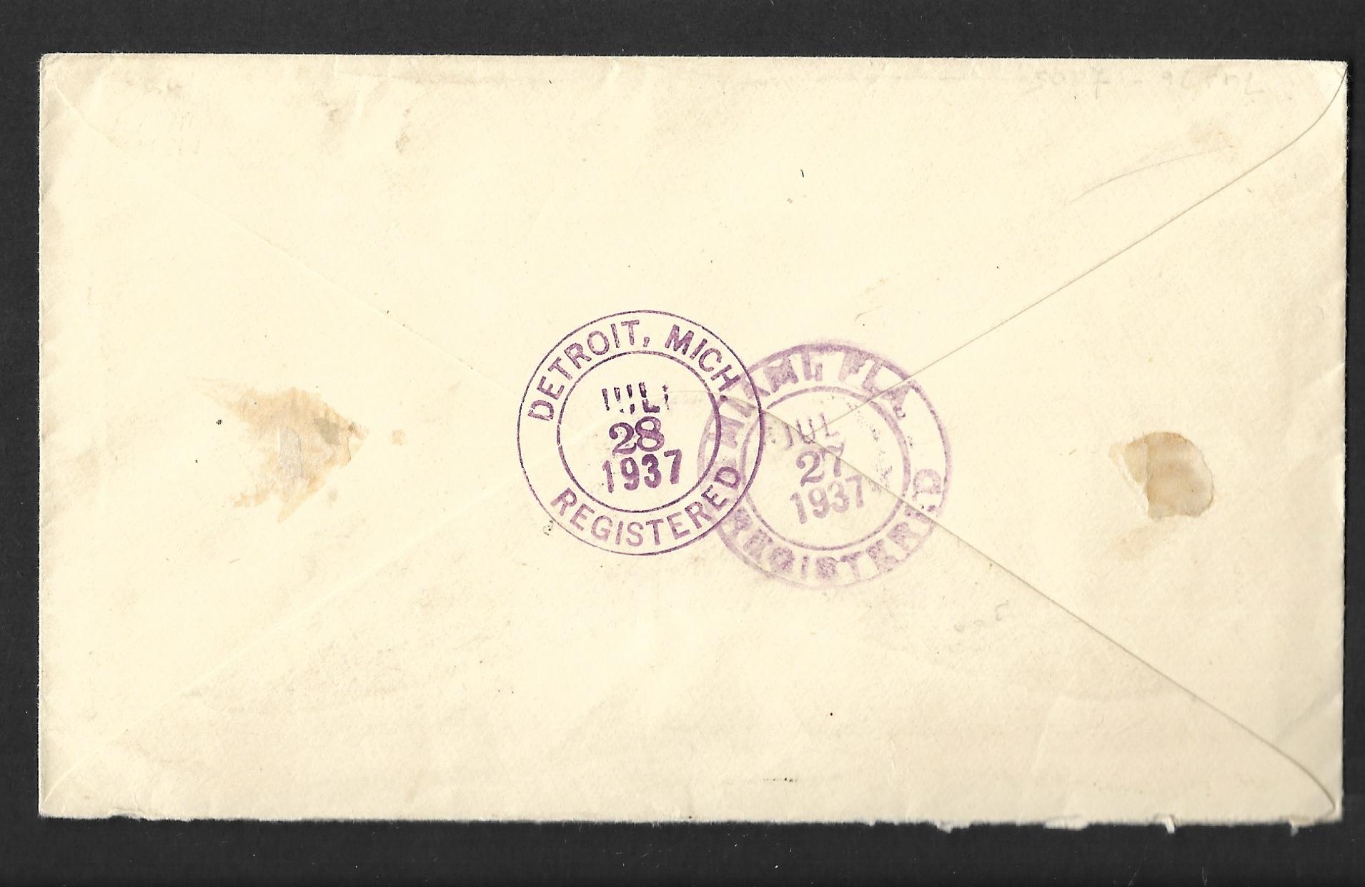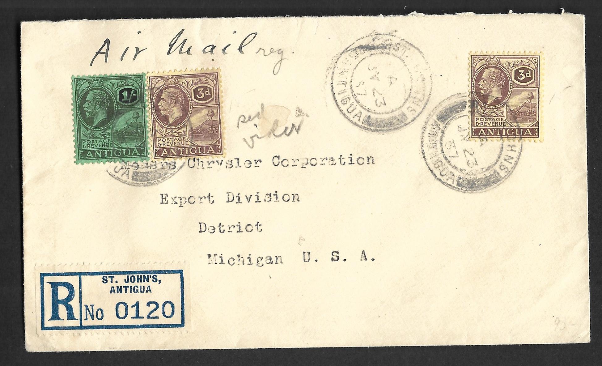 Antigua 1937 George V Registered cover to Detroit USA at double rate (One Shillings and Six Pence). Sent to Chrysler Corporation.