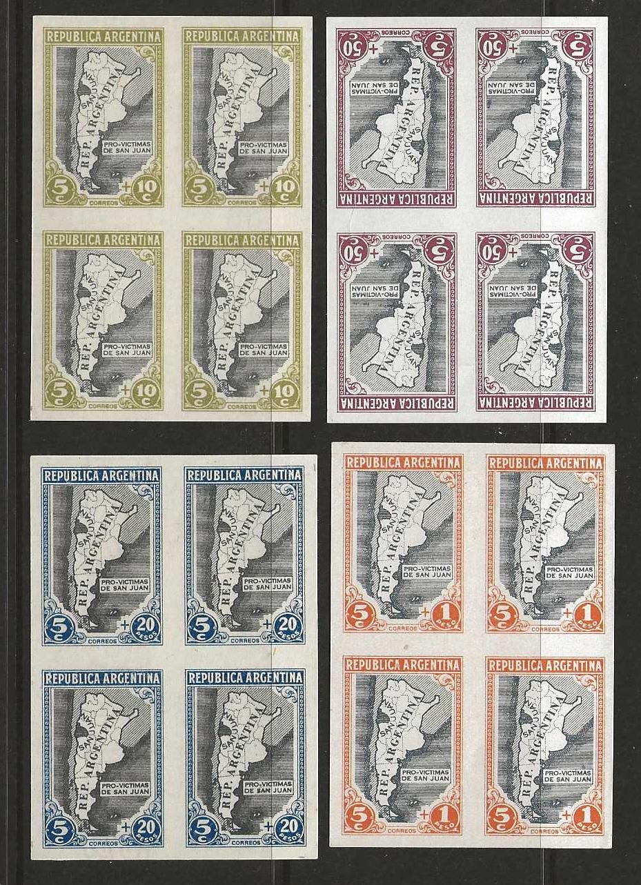 Argentina 1944 San Juan Imperf Proofs blocks of four in unissued colours on card mounted mint