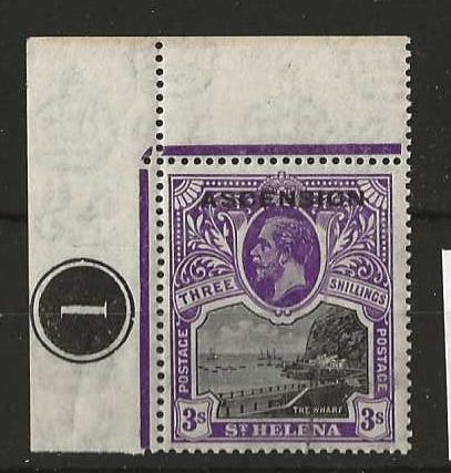 Ascension 1922 George V Three Shillings top left marginal Plate 1 unmounted mint. SG 8. Cat £140.