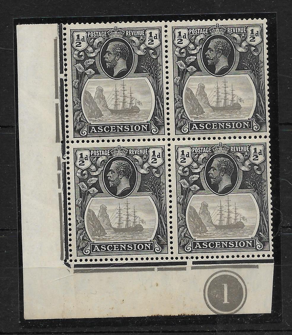 Ascension 1924 George V One Penny corner Plate block of four with flaw, R 5/1 Cleft Rock unmounted mint. SG 10. cat £110+.