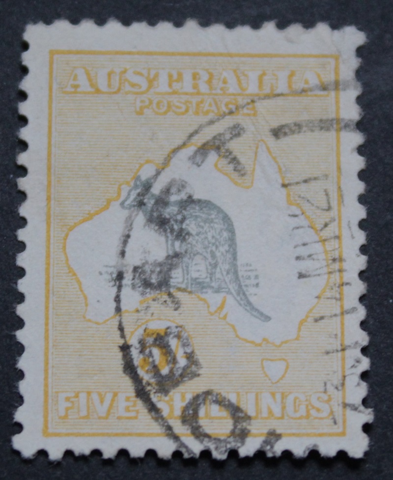 Australia 1918 Five Shillings Kangaroo third watermark used. Stamp is good/fine used with a HOBART postmark. (Has a crease at top right). Has a significant shift of Kangaroo to left. SG 42. Cat £120.