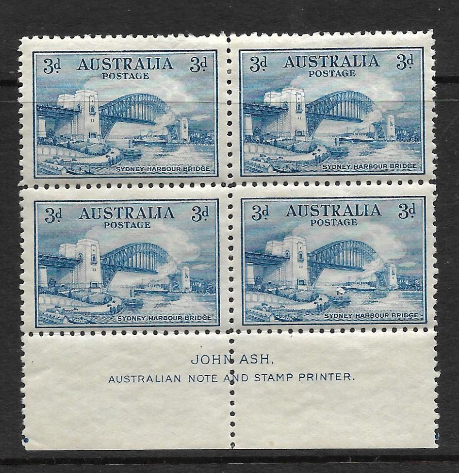 Australia 1932 Sydney Harbour Bridge Three Pence John Ash Imprint block of four mounted mint. BW Cat Aus $50. Top two stamps very lightly mounted, bottom two are unmounted mint.