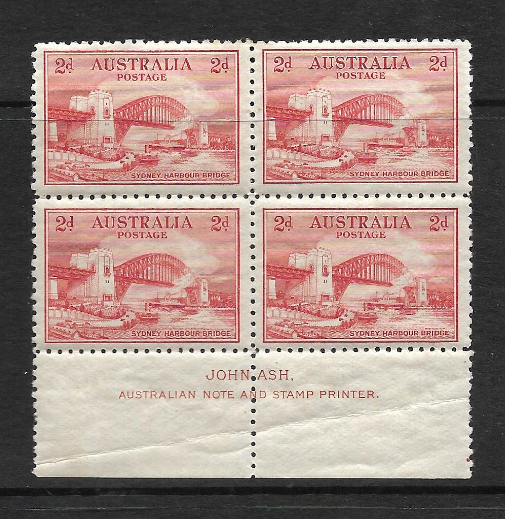 Australia 1932 Sydney Harbour Bridge Two Pence John Ash Imprint block of four mounted mint. SG 141. BW Cat Aus $40. Top two stamps very lightly mounted, bottom two are unmounted mint.