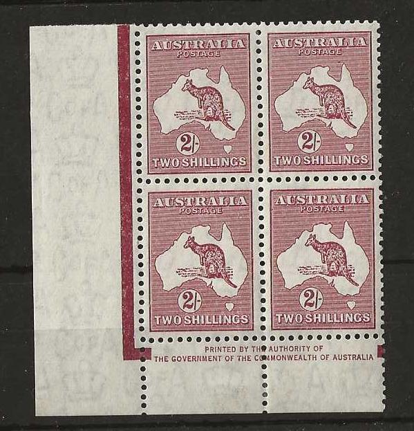 Australia 1935 Two Shillings Kangaroo (C of A watermark) Imprint block of four mounted mint. (Bottom left stamp hinged, others are unmounted mint. SG 212. BW 41z. Cat Aus $100.