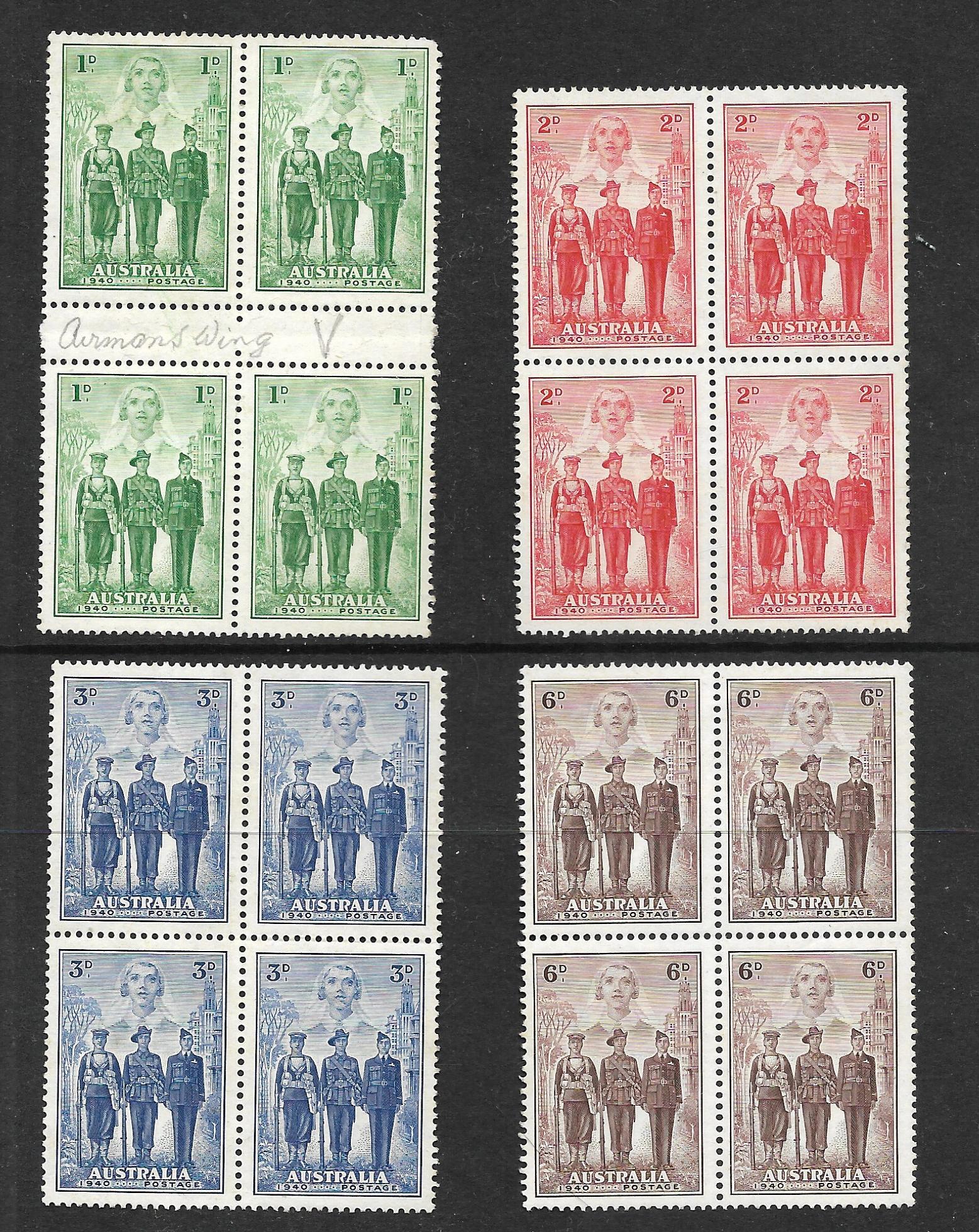 Australia 1940 Armed Forces in blocks of four with the Halfpenny having the Airmans Wings flaw mint. SG 196-199. Cat £226. One stamp on each block is lightly mounted, the rest are unmounted mint.