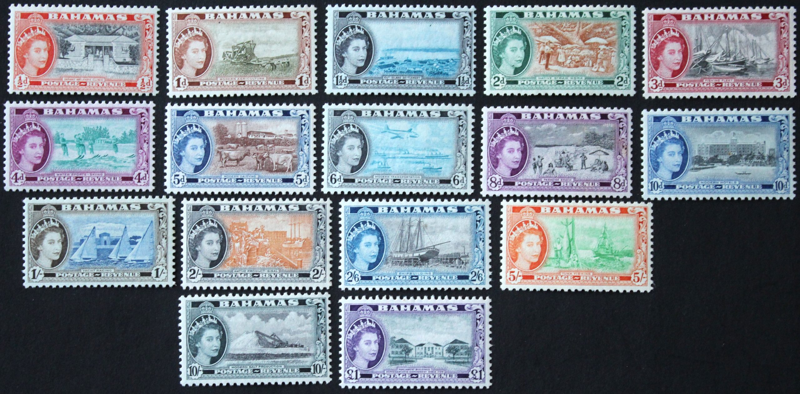 Bahamas 1954 QEII set of sixteen values to One Pound mint. Stamps are mounted mint/mint hinged. SG 201/216. Cat £100.