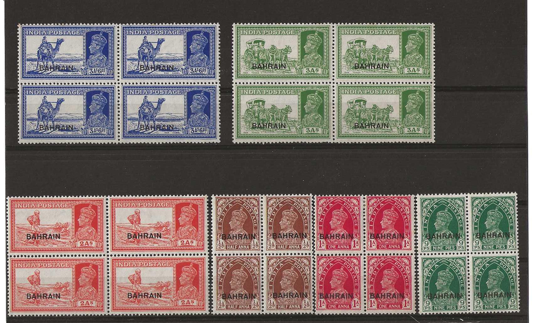 Bahrain 1938 George VI Half Anna to Three Annas and Six Pies blocks of four mounted mint. SG 21/27. Cat £288. Top two stamps in each block are mounted, bottom two are unmounted.