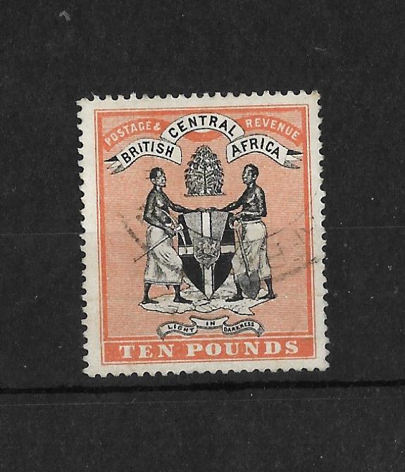 BCA/Nyasaland 1896 Ten Pounds used. Stamp is fiscally used with a part (DC) cancel. SG 41. Cat £600 if fiscally used.