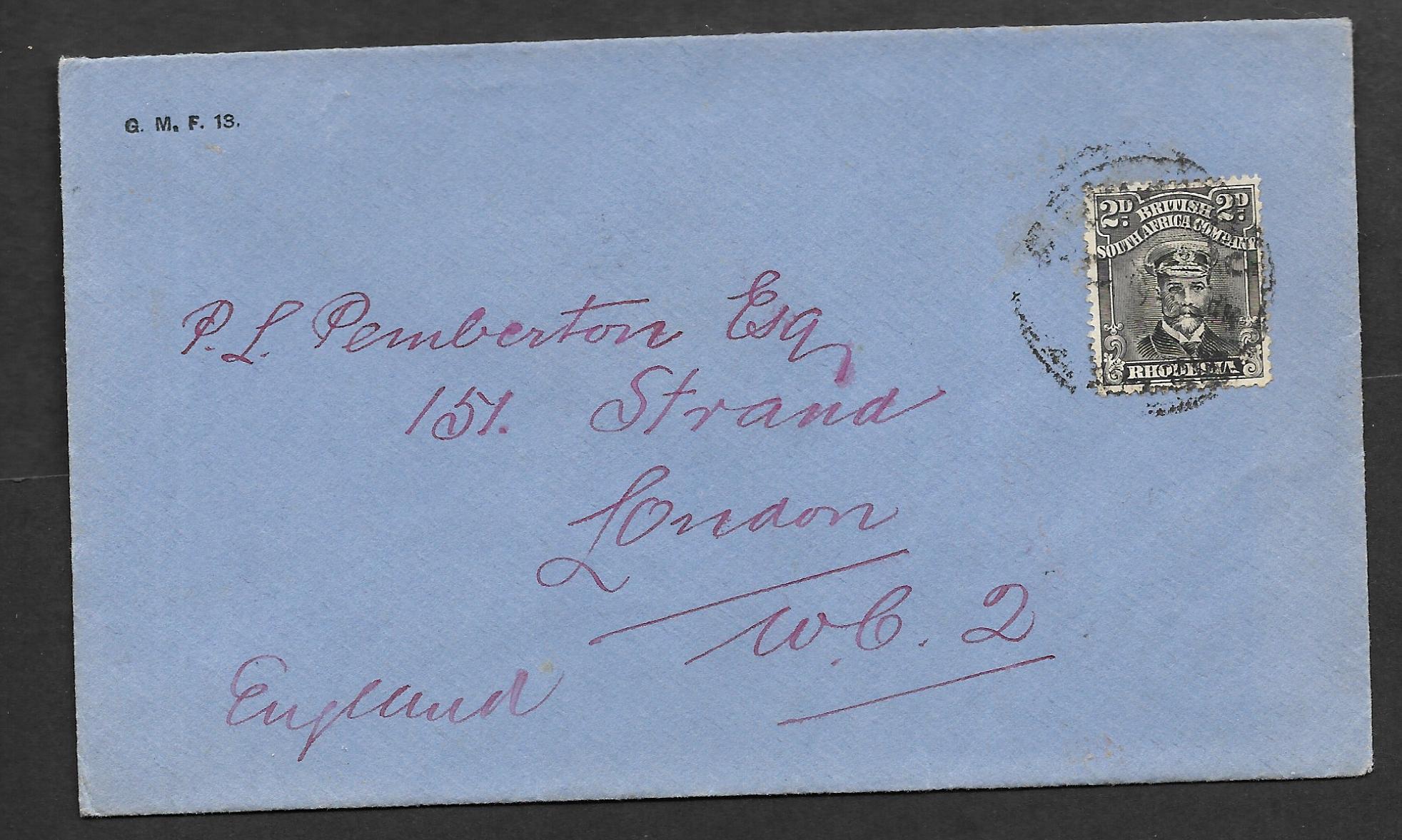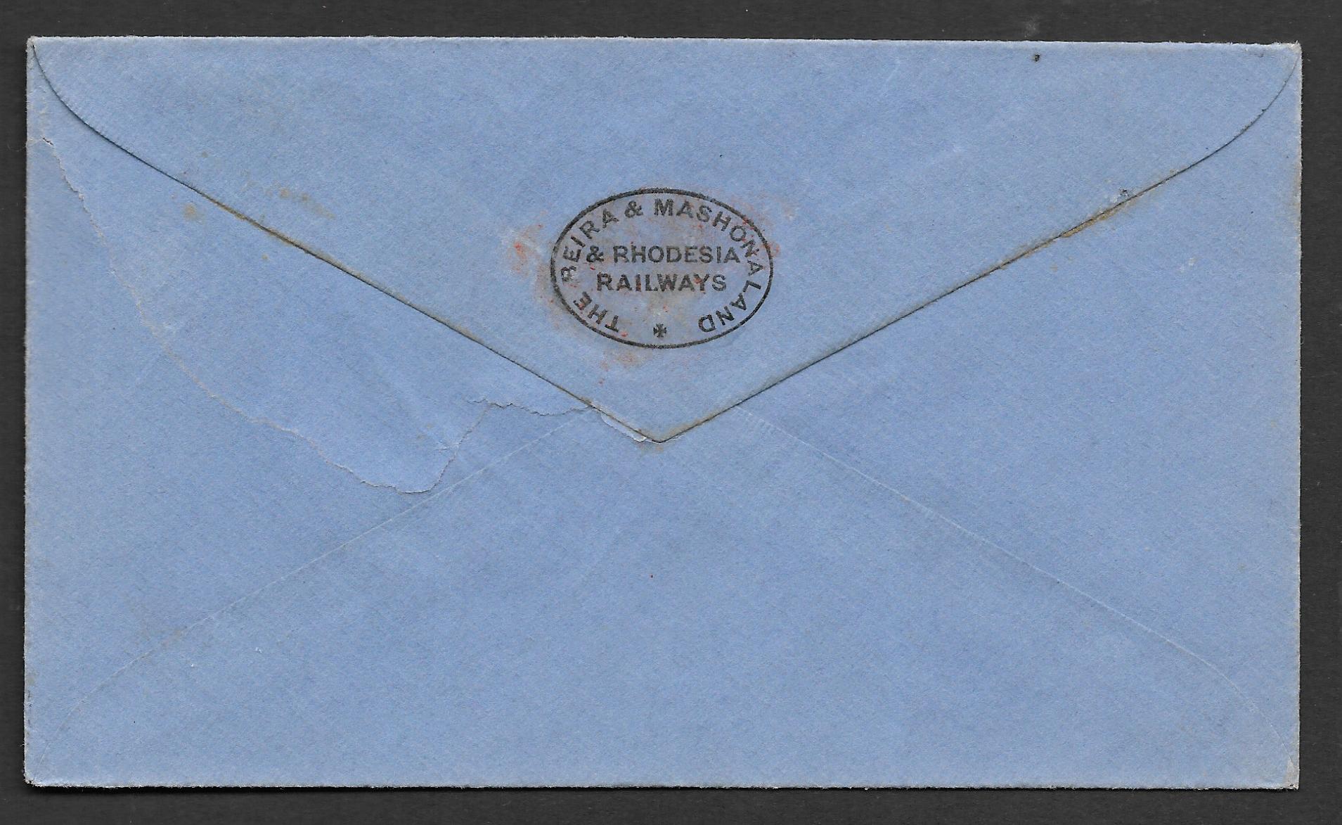 Beira and Mashonaland & Rhodesia Railways cover with a Two Pence Admiral sent to London. Has an indistinct Bulawayo cancel.