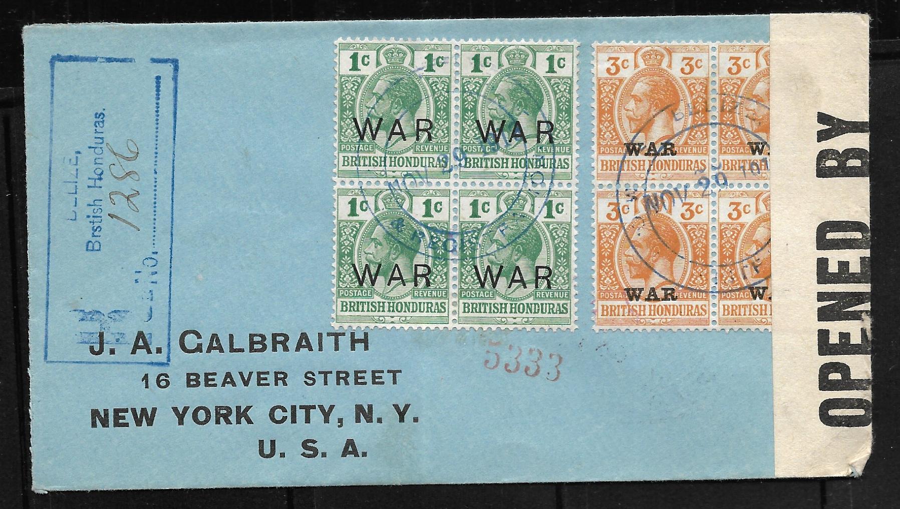 British Honduras 1918 George V WWI censored Registered War Tax Cover to United States. Sent from Belize to New York. Has censor tape at end of envelope.