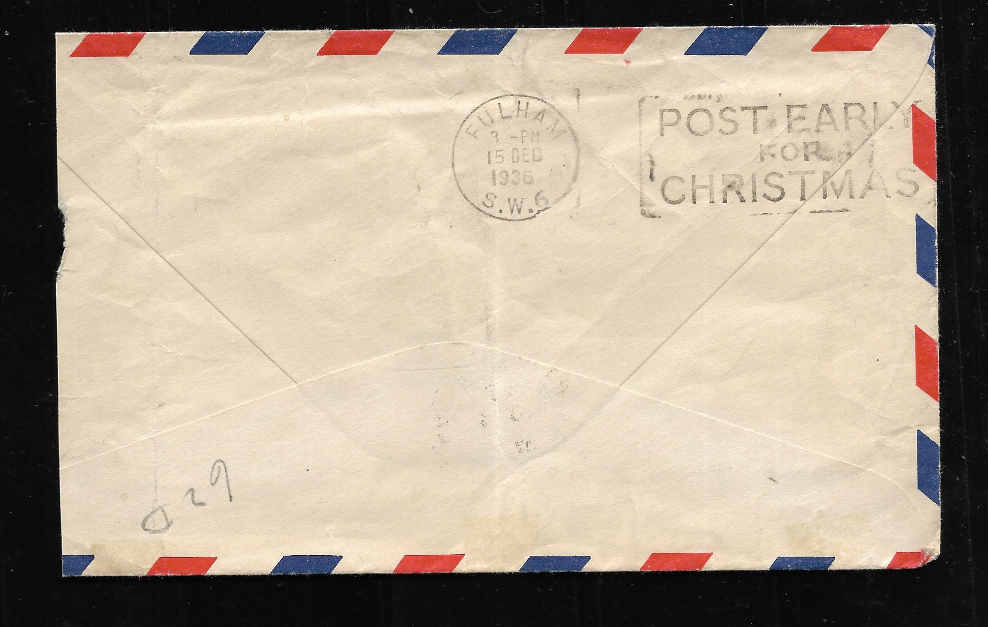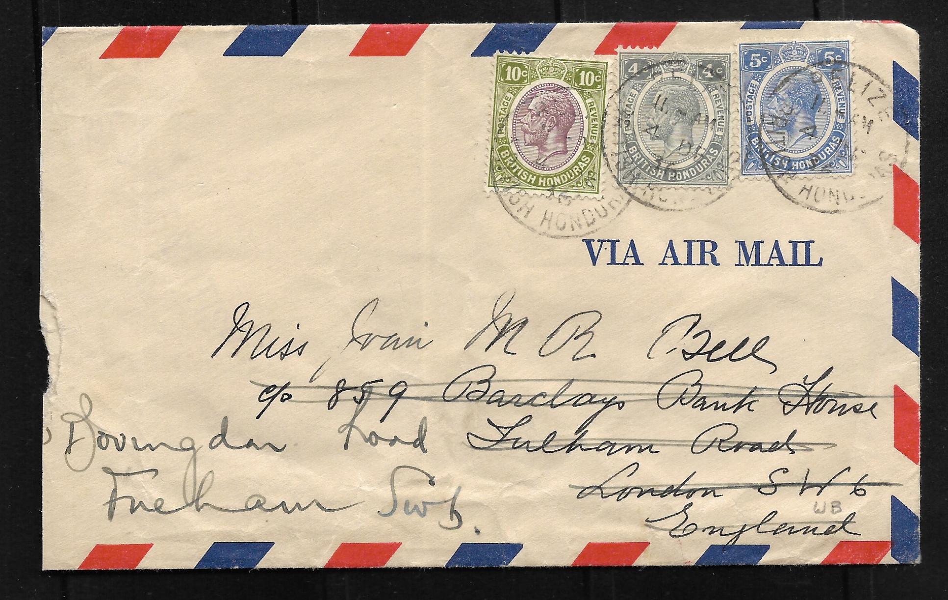 British Honduras 1936 George V Re-directed Air Mail cover to England. Has a Fulham receiving mark on back.
