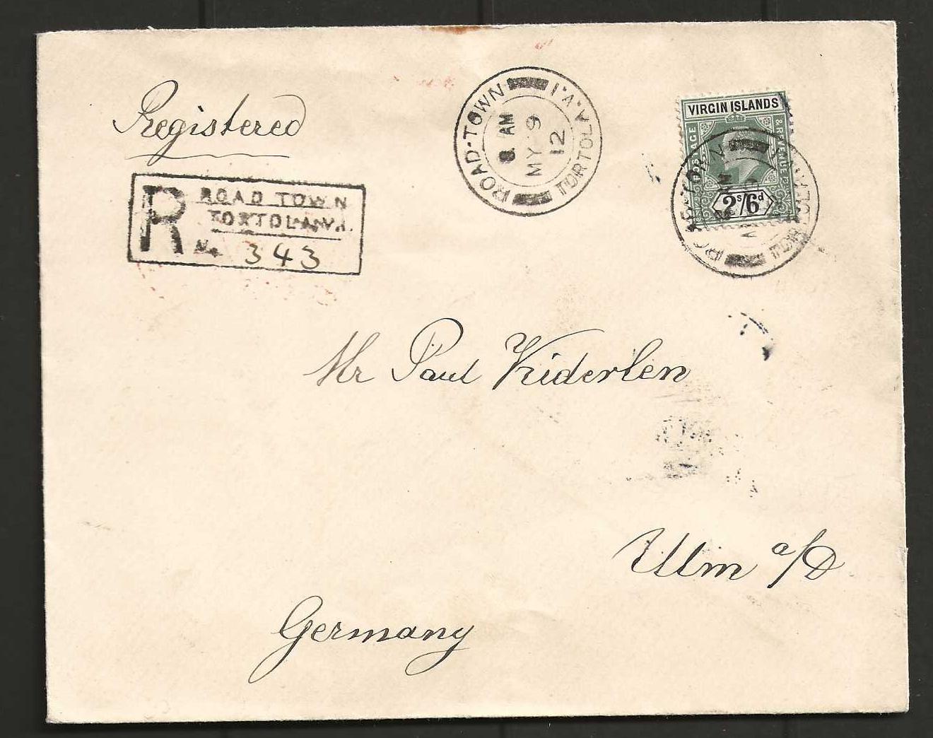British Virgin Islands 1912 Edward VII Two Shillings and Sixpence on Registered cover to Germany. Cat £330.