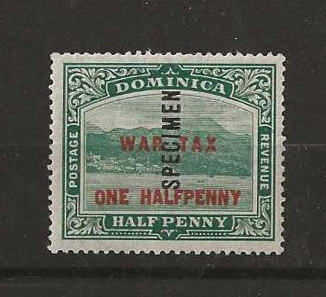 Dominica 1916 George V War Tax overprinted SPECIMEN lightly mounted mint. SG 55. Not listed by SG.