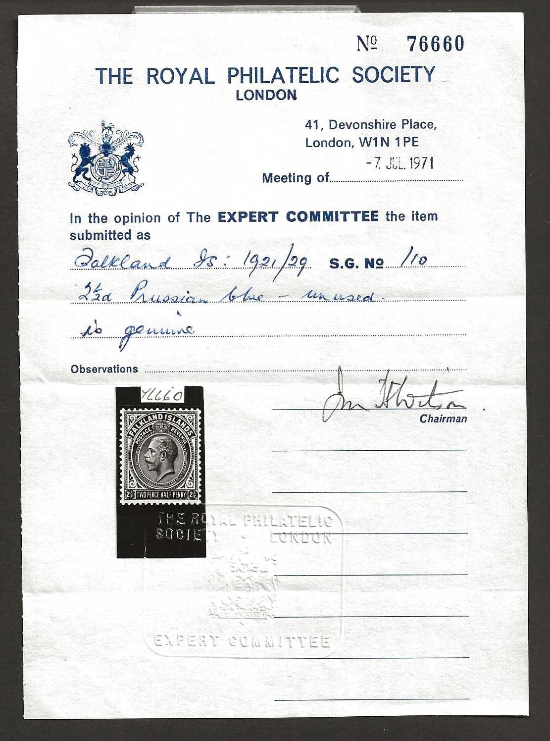 Falkland Islands 1921 George V Two and Halfpence Prussian Blue mounted mint with Royal Cert dated 1971. No longer listed by Gibbons, but listed by Heijtz.