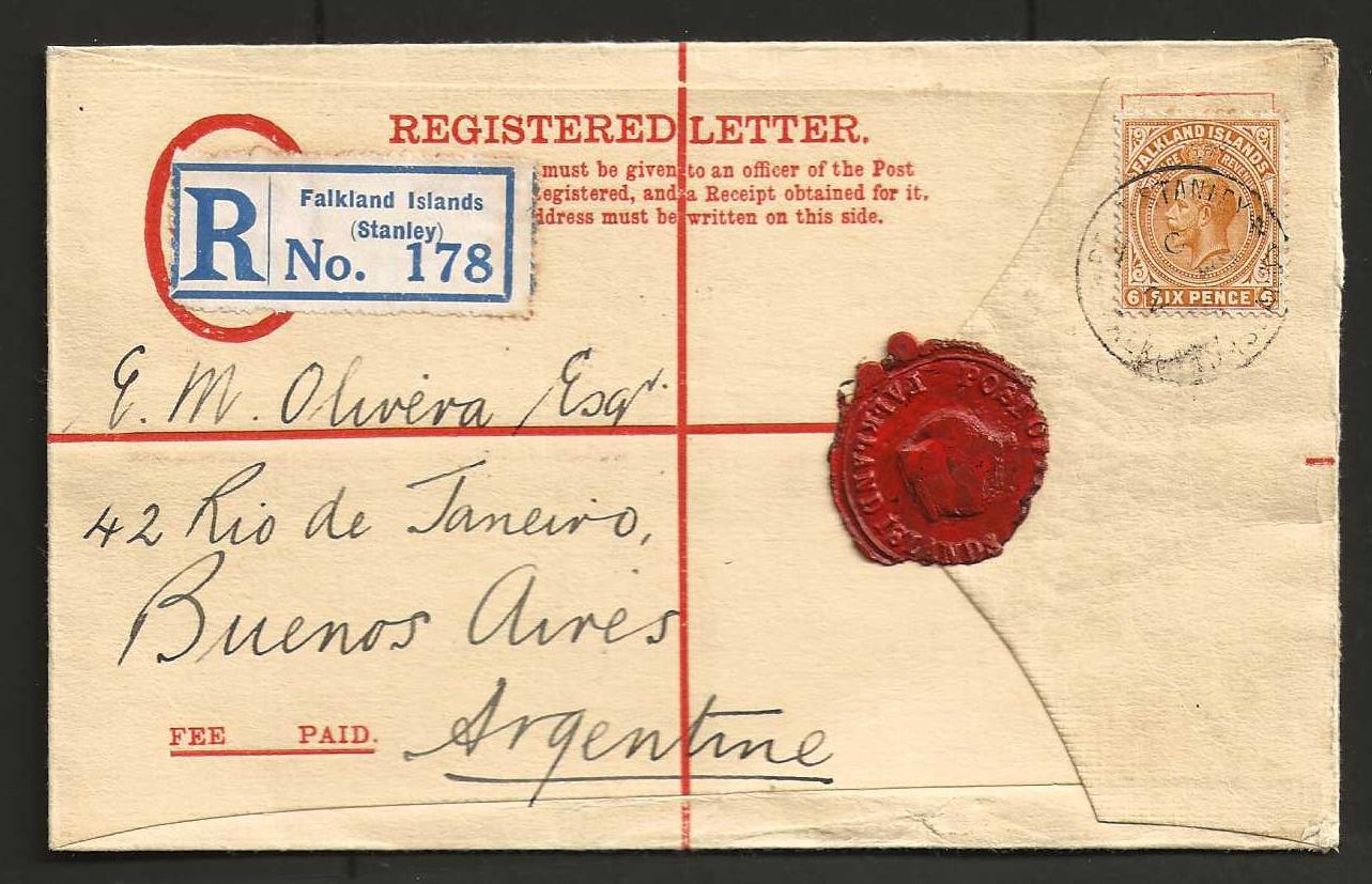 Falkland Islands 1928 GV Registered cover to Argentina