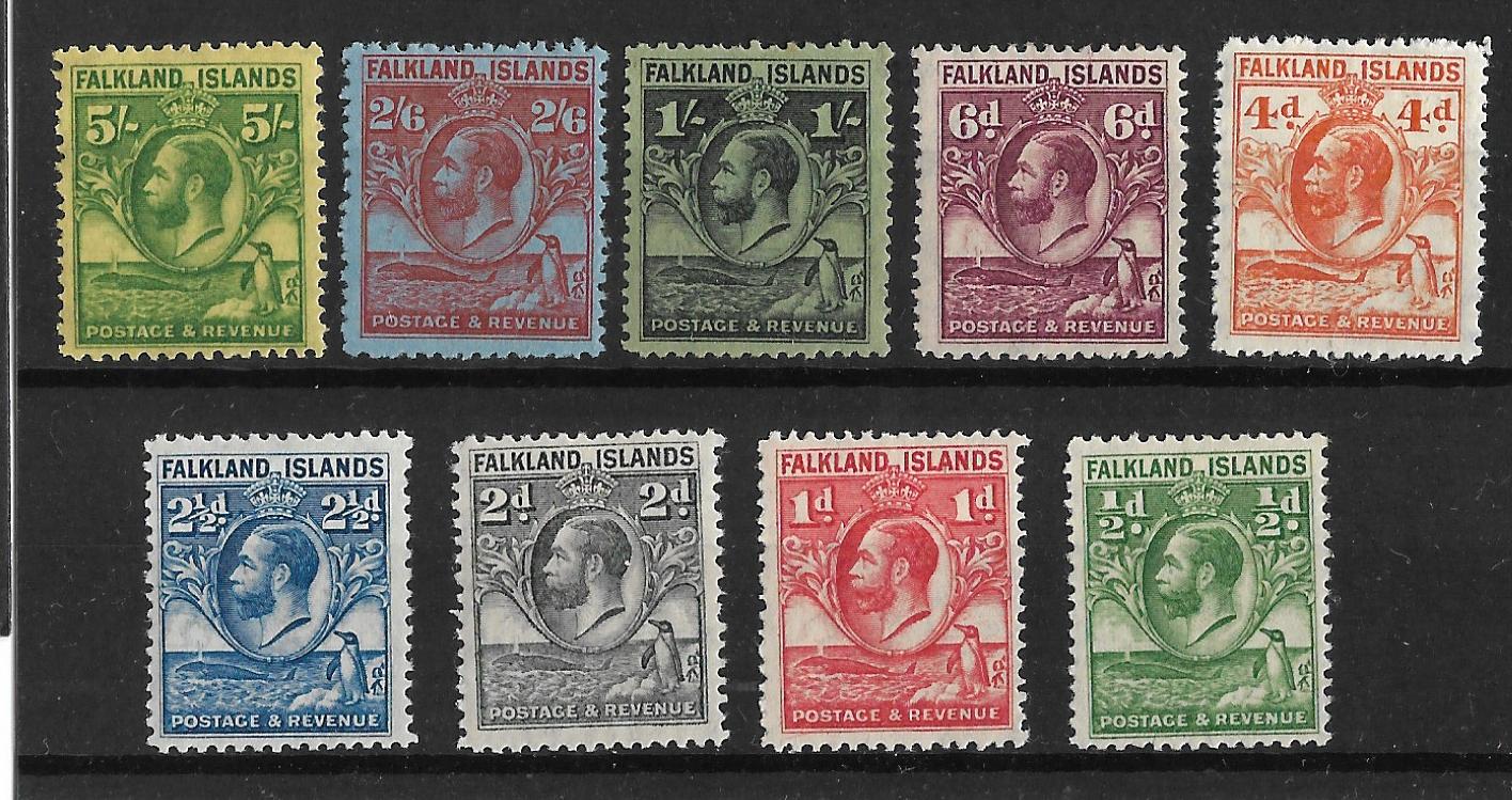 Falkland Islands 1929 George V Whale and Penguin set Halfpenny to Five Shillings mounted mint. SG 116/124. Cat £250.