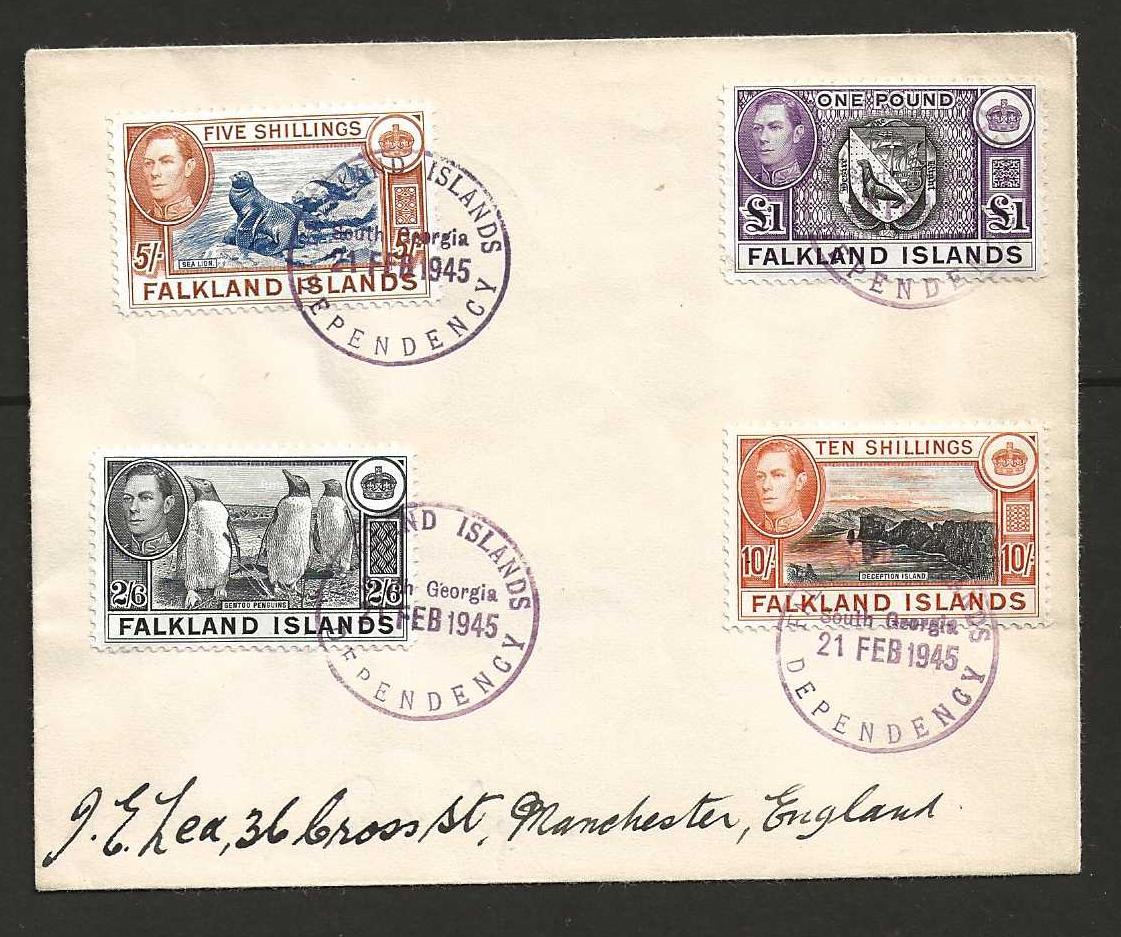 Falkland Islands 1945 George VI High Values on cover from South Georgia to England. Philatelic, but rare.