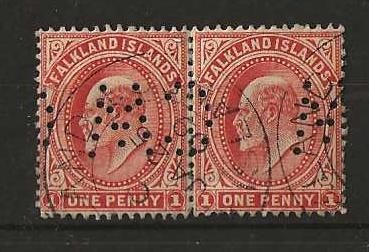 Falkland Islands Edward VII One Penny pair used with CW in Perfin. Cat £400 each by Heijtz. Inverted perfin.
