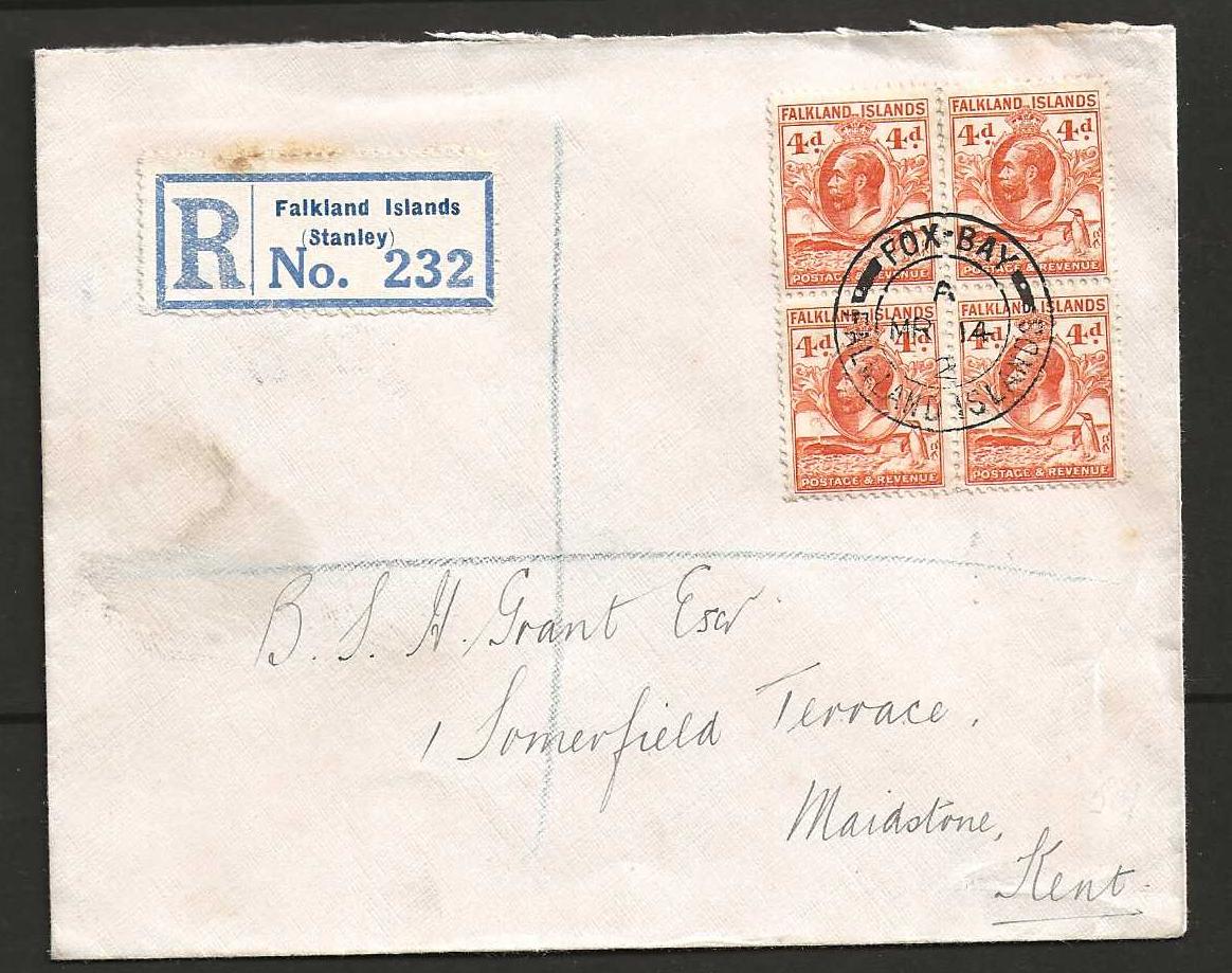 Falkland Islands KGV Registered Cover to Kent from Fox Bay scarce quantity