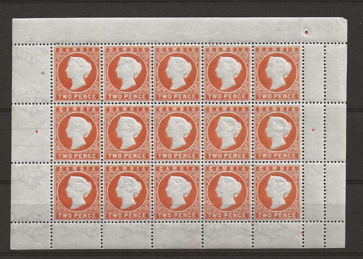 Gambia 1887 Queen Victoria Two Pence complete sheet of fifteen unmounted mint. (Hinged on margins only). SG 24. Cat £225.