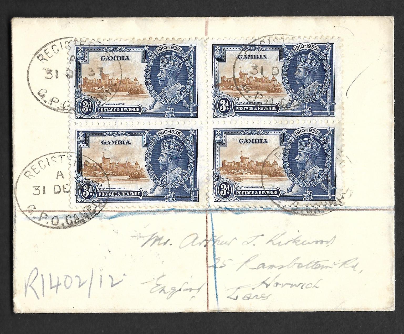 Gambia 1935 George V Silver Jubilee registered cover with Three Pence block of four. Cover sent to England, not first day.