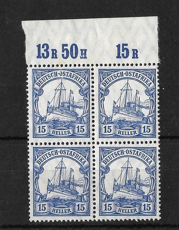 German East Africa 1905 Fifteen Heller marginal block of four unmounted mint. Michel 33b (Has a tone spot at top). Cat 48 Euros.