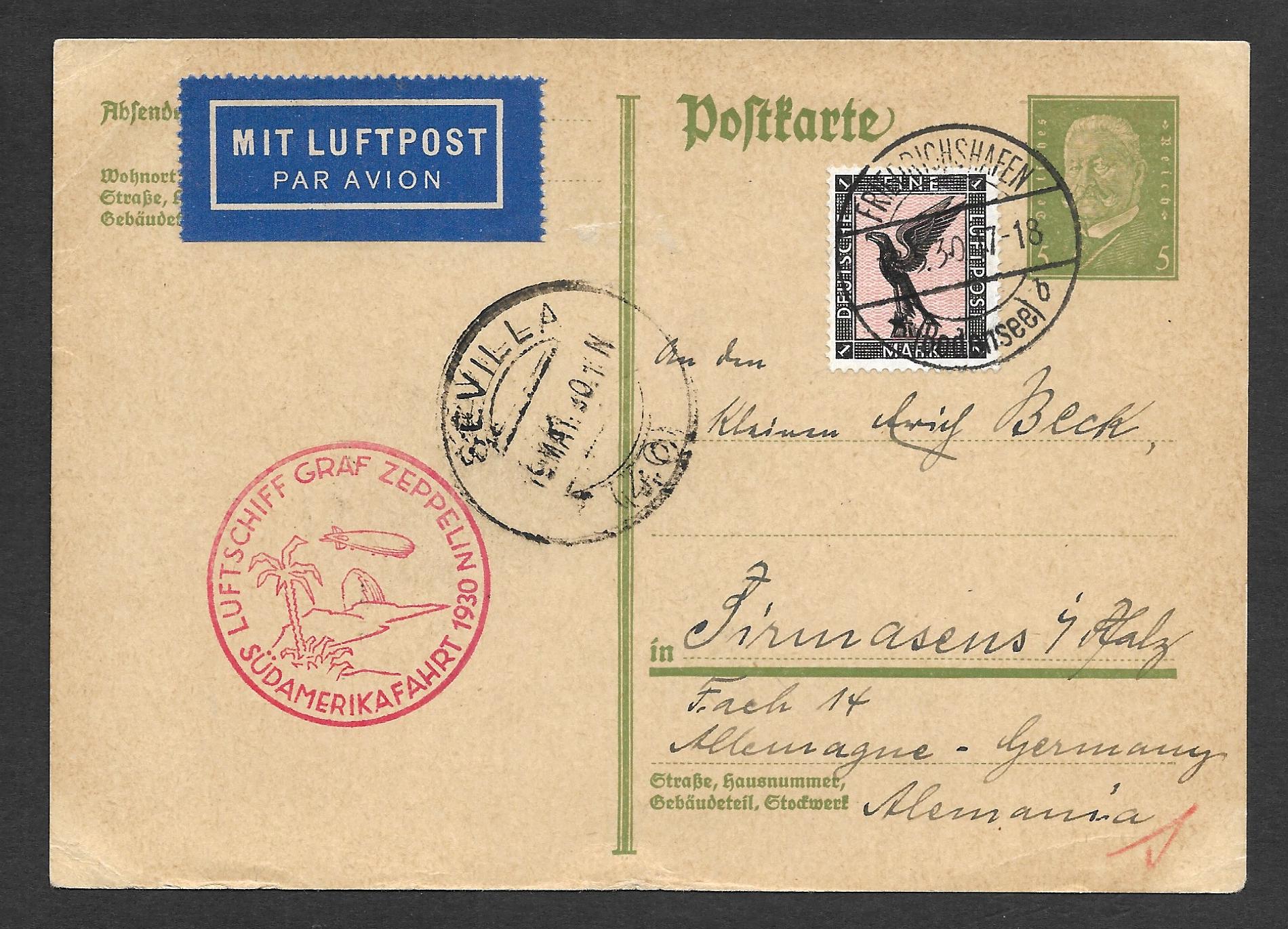 Germany 1930 Zeppelin card from Germany to South America with cachets.