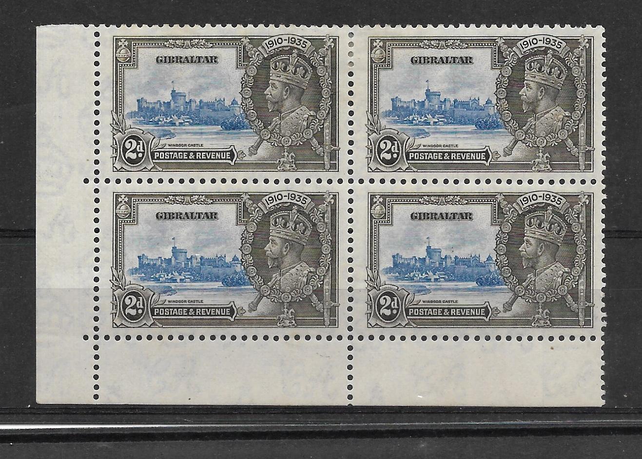 Gibraltar 1935 George V Silver Jubilee Two Pence corner block of four with extra flagstaff flaw mounted mint. SG 114a. Cat £75.