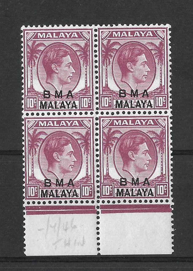 Malaya/BMA 1946 Ten Cents (thin striated paper) marginal block of four unmounted mint. Has a pencil notation at bottom. SG 8d. Cat £120.