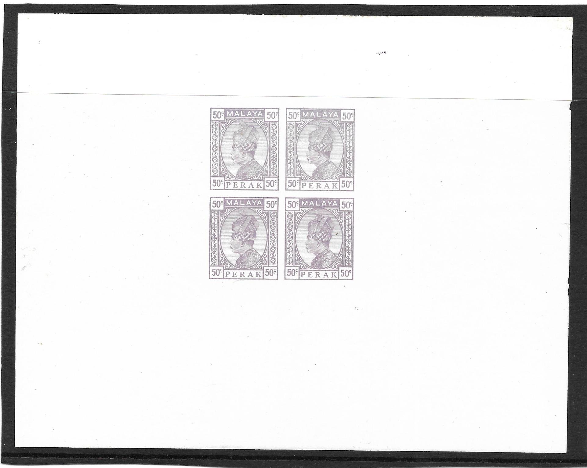 Malaya Perak 1935 Fifty Cents block of four printer proof on white card in light grey. Most unusual.