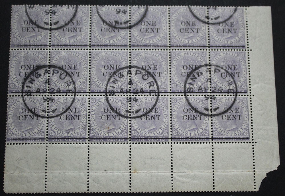 Malaya/Straits Settlements 1892 Queen Victoria One Cent overprint on bottom right marginal block of eighteen used. (Stamps still have gum on rear and has a couple of small tone spots). SG 90. Cat £270.