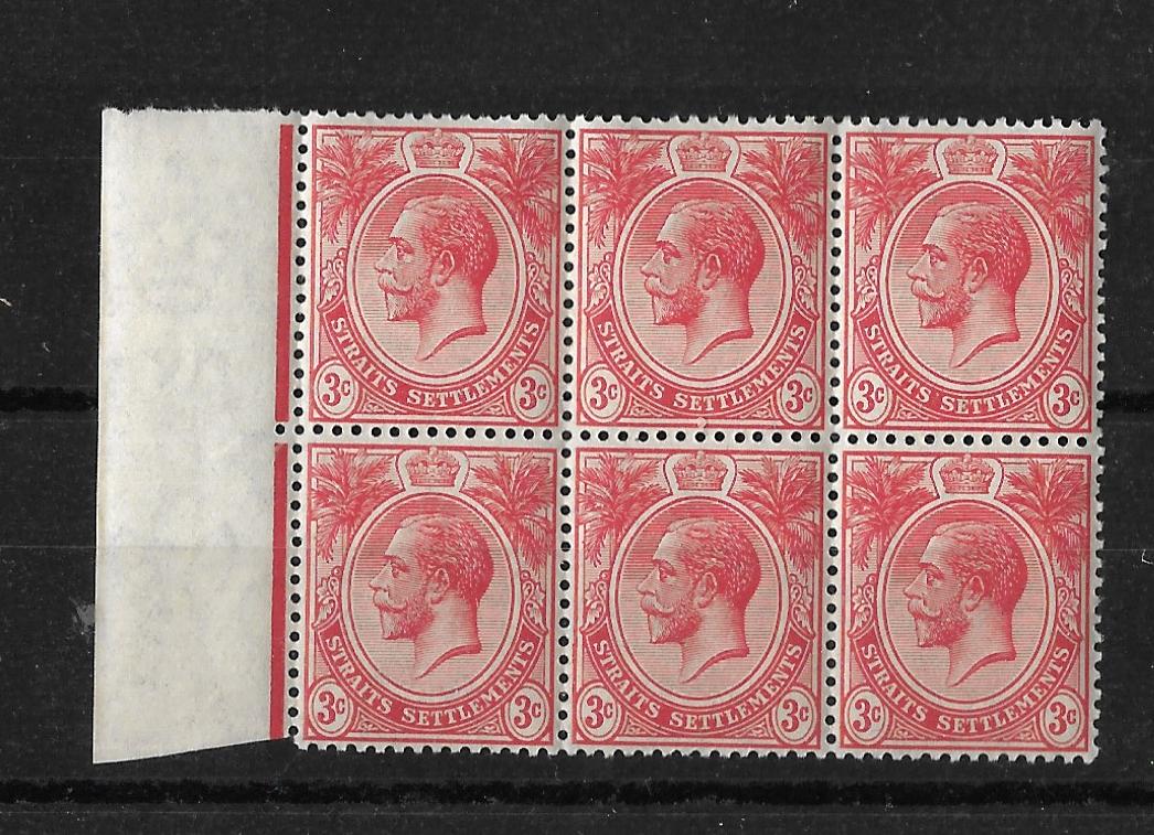 Malaya/Straits Settlements 1912 George V Three Cents block of six unmounted mint. SG 196. Cat £21++.