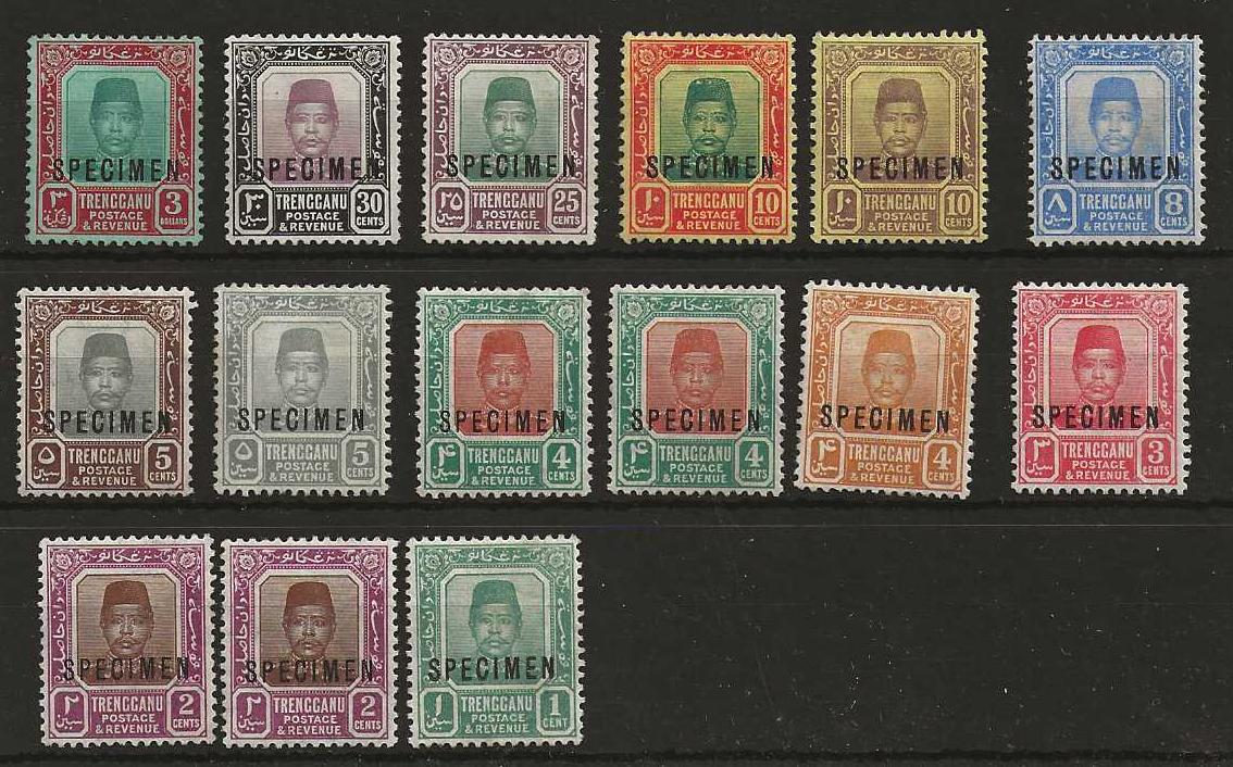 Malaya/Trengganu 1910 One Cent to Three Dollars overprinted SPECIMEN mounted mint/mint hinged. SG 1s/16s. Cat £500.