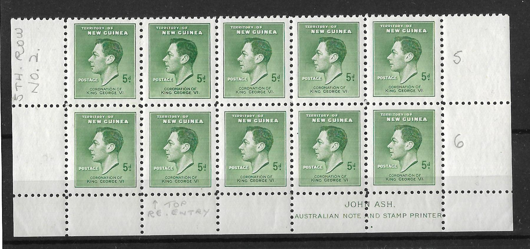 New Guinea 1937 George VI Coronation Five Pence bottom two rows including re-entry and Printers Imprint unmounted mint. Cat £75+.
