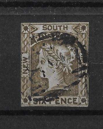 New South Wales 1852 Queen Victoria Six Pence used. Stamp is good/fine used. SG 77. Cat £325. Has three and a half margins.