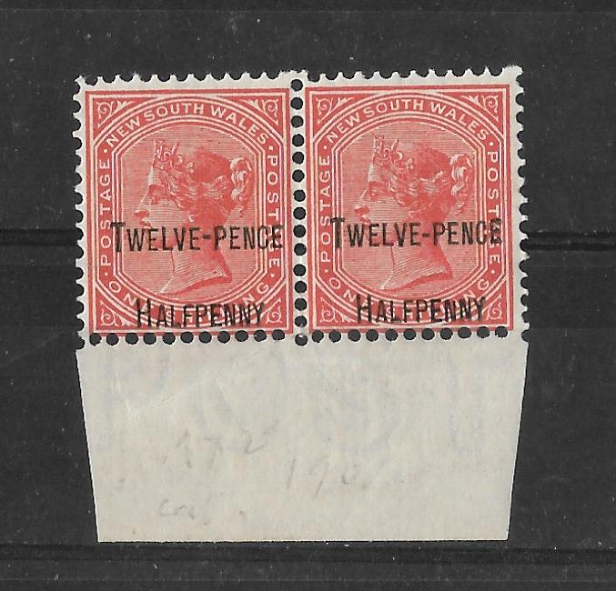 New South Wales 1891 Queen Victoria Twelve Pence overprint marginal pair unmounted mint. SG 268e. Cat £70+.