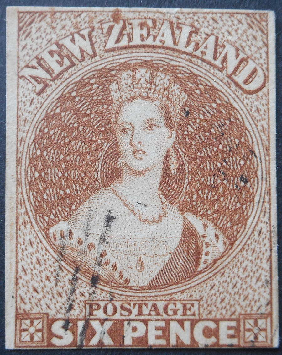 New Zealand 1857 Queen Victoria Six Pence Chalon (Pale Brown) used. Stamp is good/fine used. SG 14. Cat £325.