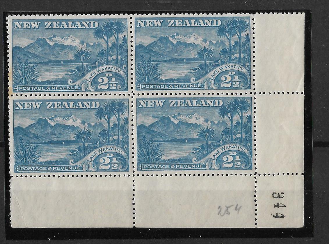 New Zealand 1898 Queen Victoria Two and Halfpence corner block of four with sheet no unmounted mint. SG 250. Cat £240+.