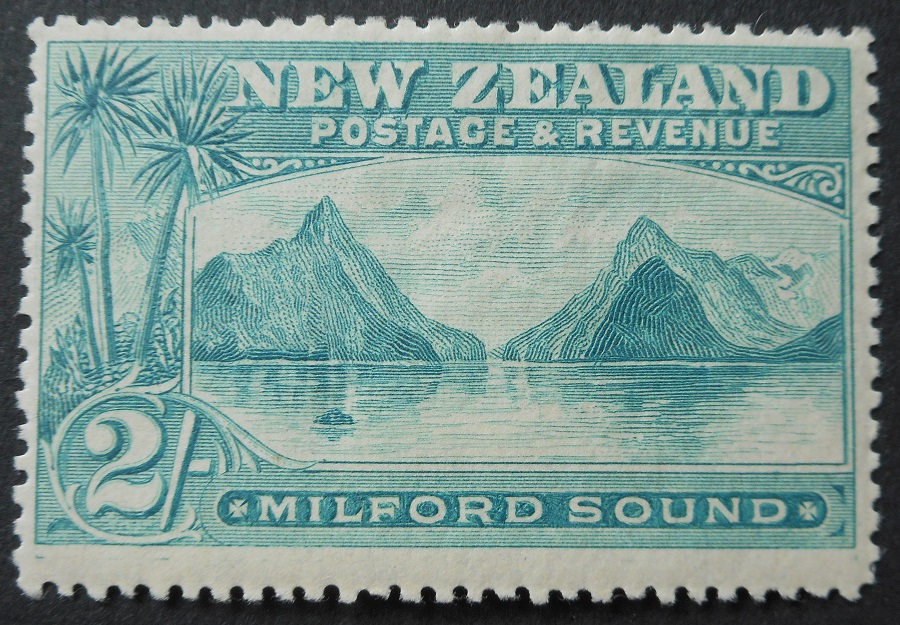 New Zealand 1898 Two Shillings (Milford Sound) perf 14 no watermark mint. Stamp is mounted mint/mint hinged. (One hinge mark). SG 258. Cat £180.