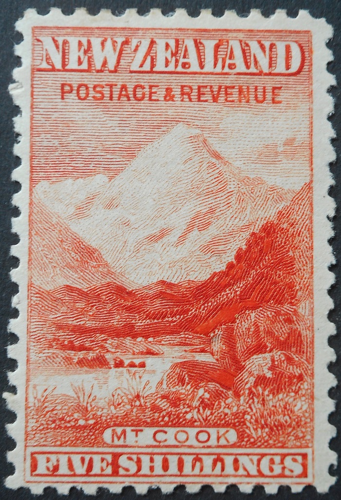 New Zealand 1899 Five Shillings (Mt Cook) perf 11 no watermark mint. Stamp is mounted mint/mint hinged. (One hinge mark). SG 270. Cat £300.