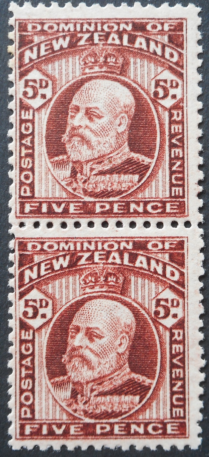 New Zealand 1916 Edward VII Five Pence vertical pair (perf 14×14½ and 14×13½) mint. Both stamps are mounted mint (One hinge mark). SG 402a. Cat £65.