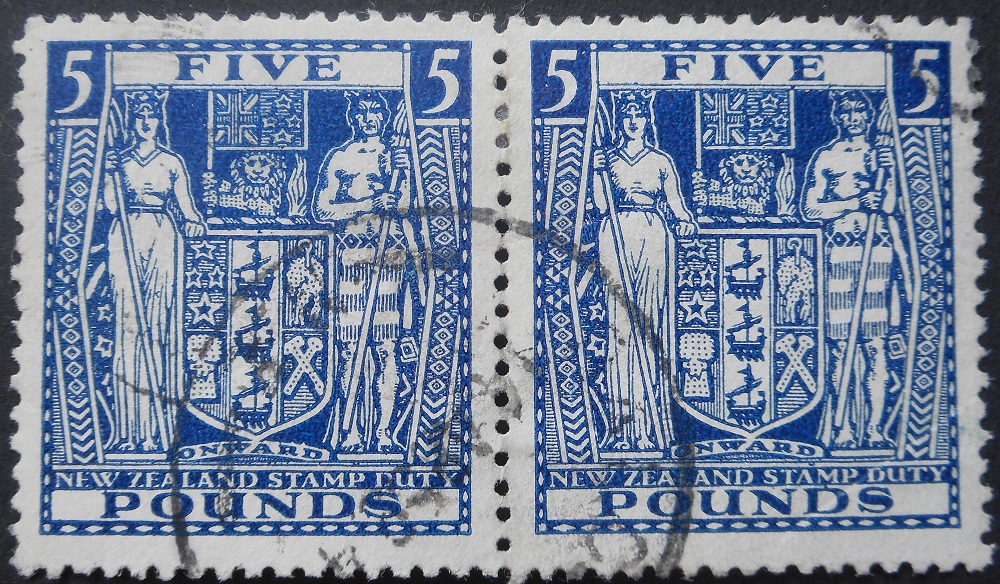 New Zealand 1950 Five Pounds pair with inverted watermark used. Stamps are good/fine used. SG F211w. Cat £140. (Has a small crease).