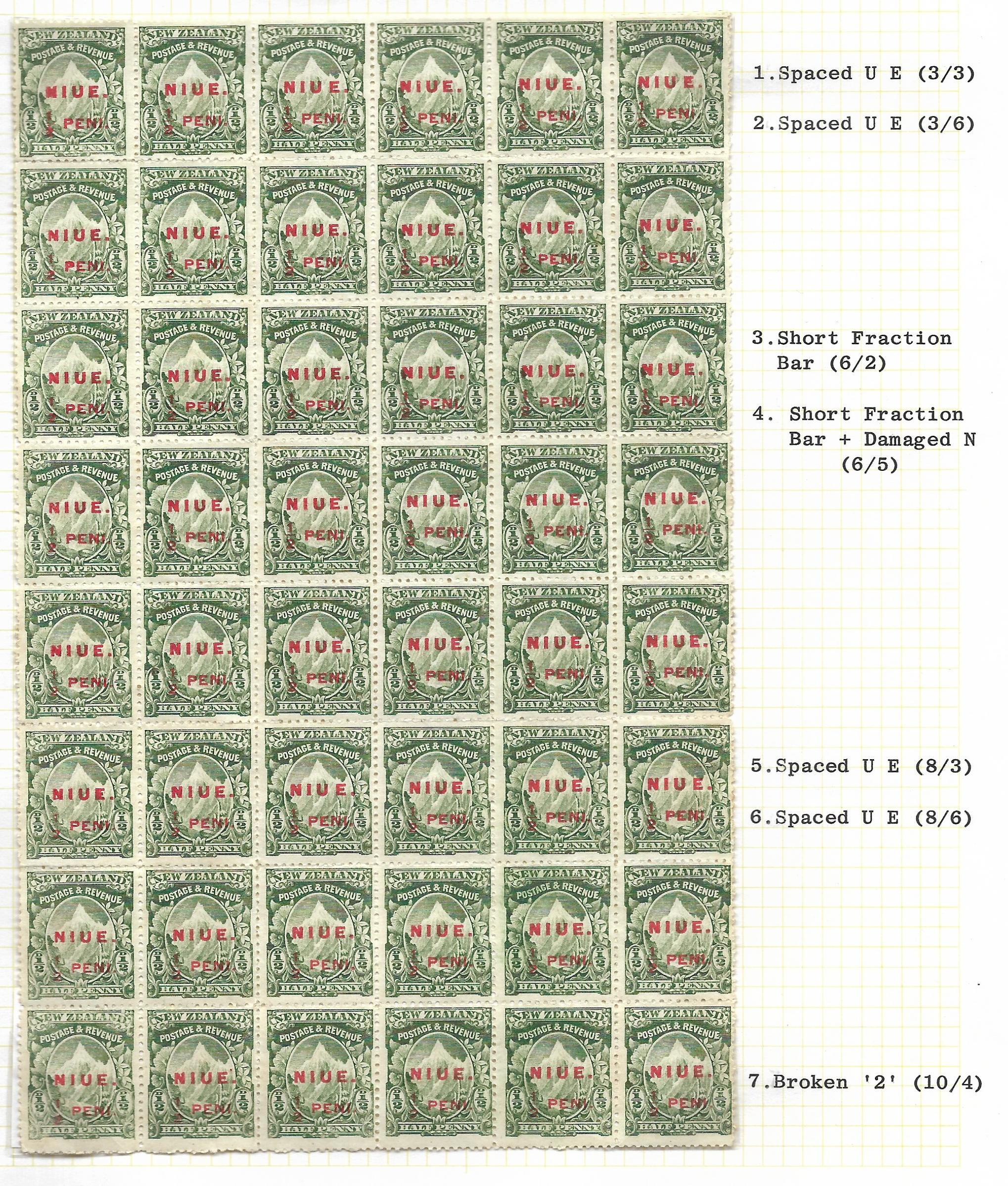 Niue 1917 Halfpenny surcharge with various varieties block of forty two mint. Some have no gum. SG 8, 8a x 4.