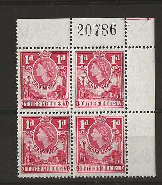 Norther Rhodesia QEII One Penny Revenue top right marginal block of four with Sheet number unmounted mint.
