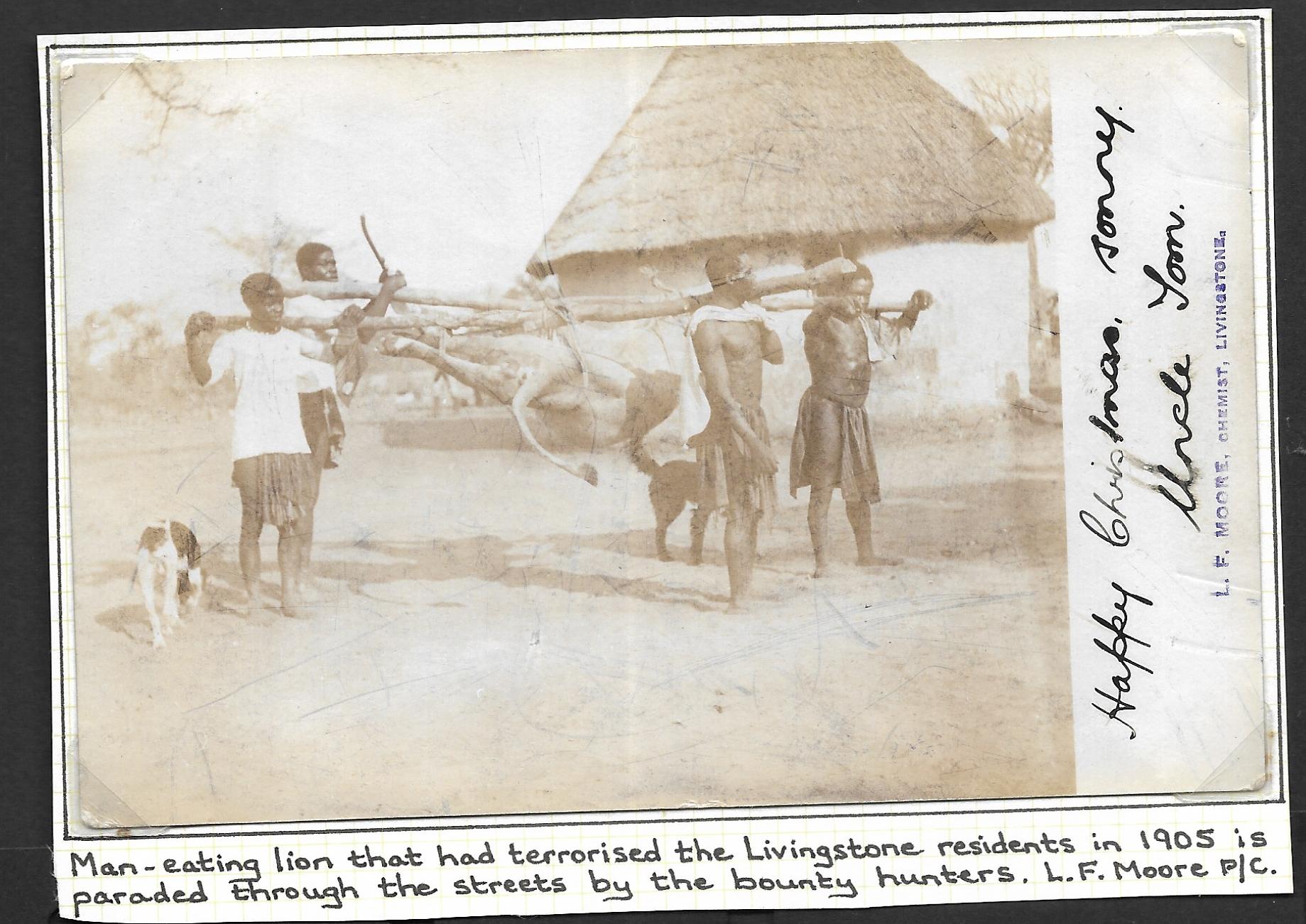 Northern Rhodesia 1905 real photo postcard of Livingstone’s man eater used. With Livingstone postmark.