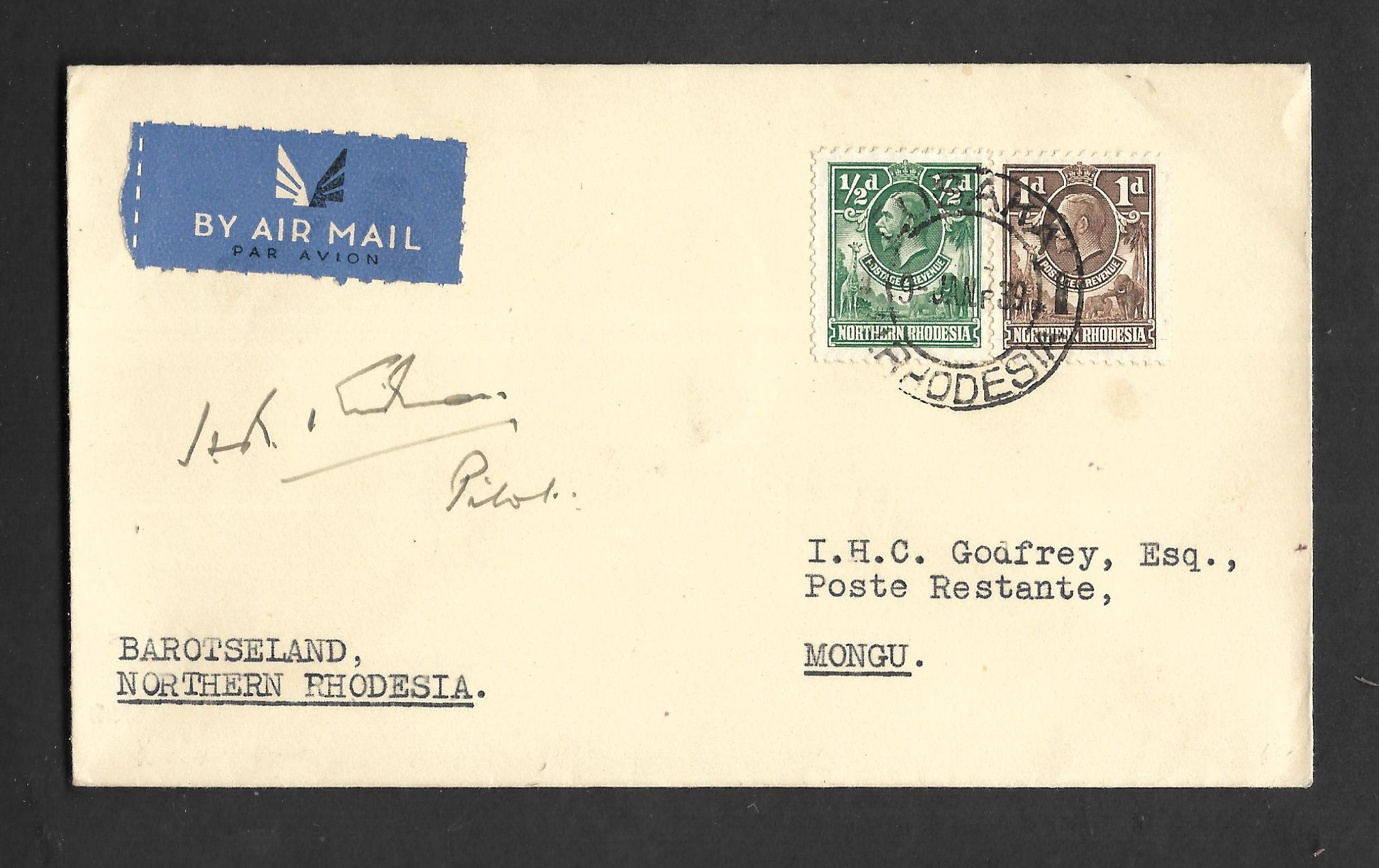 Northern Rhodesia 1934 First Flight Lusaka to Mongu pilot signed cover.