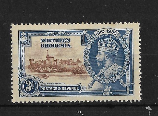 Northern Rhodesia 1935 George V Silver Jubilee Three Pence with line by turret flaw mounted mint. SG 20f. Cat £275. (Has one hinge mark).