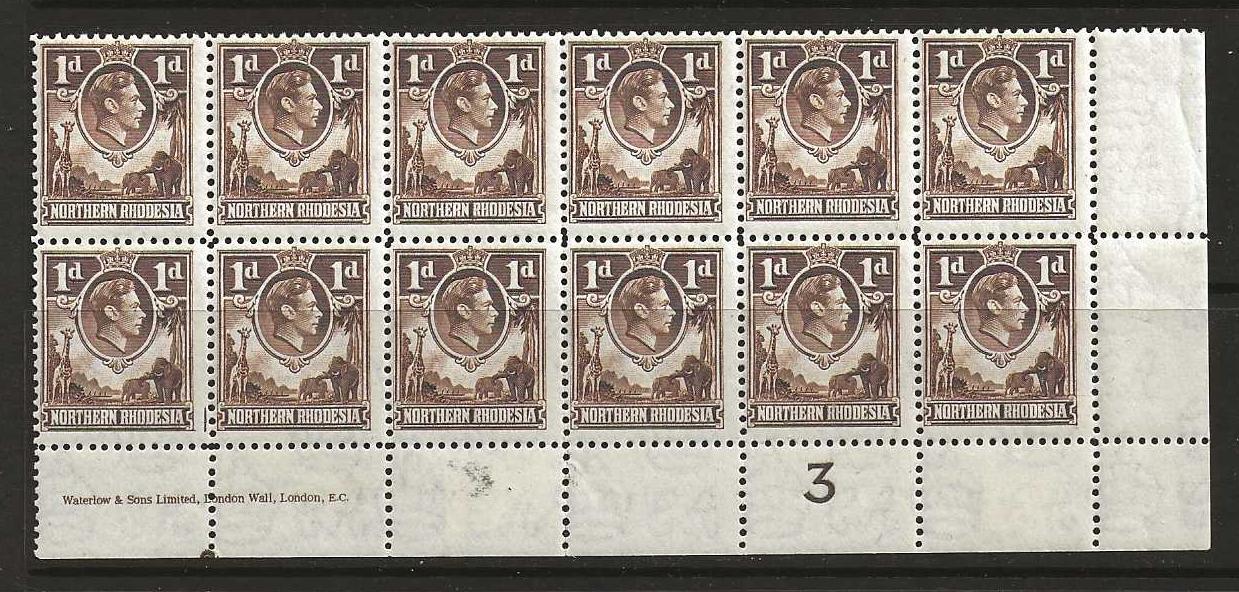 Northern Rhodesia 1938 George VI One Penny bottom margin Imprint and Plate 3 block of twelve unmounted mint. SG 27.