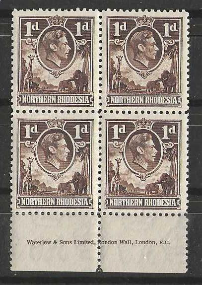 Northern Rhodesia 1938 George VI One Penny bottom margin Imprint block of four unmounted mint. SG 27.